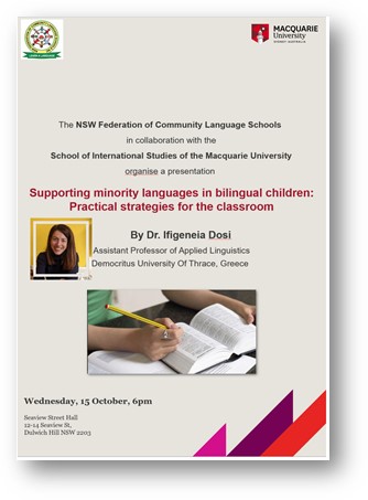 Workshop: Supporting Minority Languages in Bilingual Children – Practical Classroom Strategies Presenter: Dr. Ifigeneia Dosi, Assistant Professor of Applied Linguistics, Democritus University of Thrace (Greece) Date & Time: Wednesday, 15 October 2025 | 6:00–7:00 PM (AEDT) Format: Face-to-face AND online Venue: Seaview Street Hall, 12–14 Seaview Street, Dulwich Hill NSW 2203 Cost: Free (registration essential)