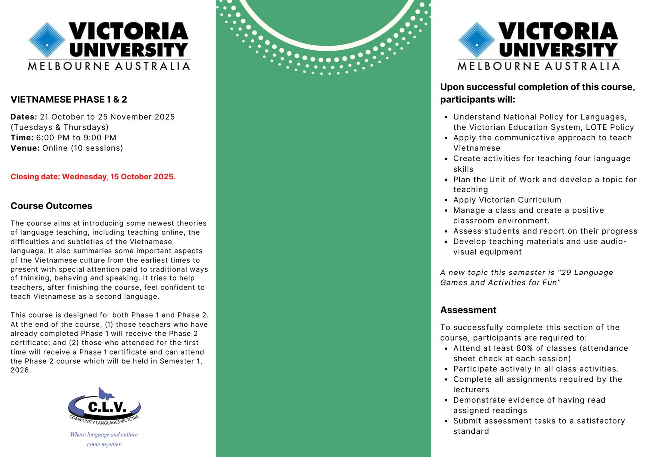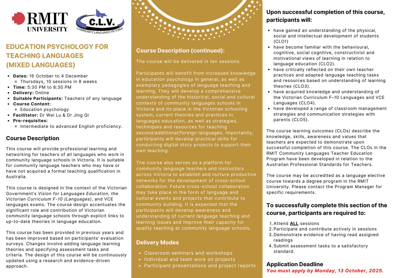 Weβre pleased to announce that registrations are now open for the Semester 2, 2025 Language Methodology Courses offered by RMIT University and Victoria University.